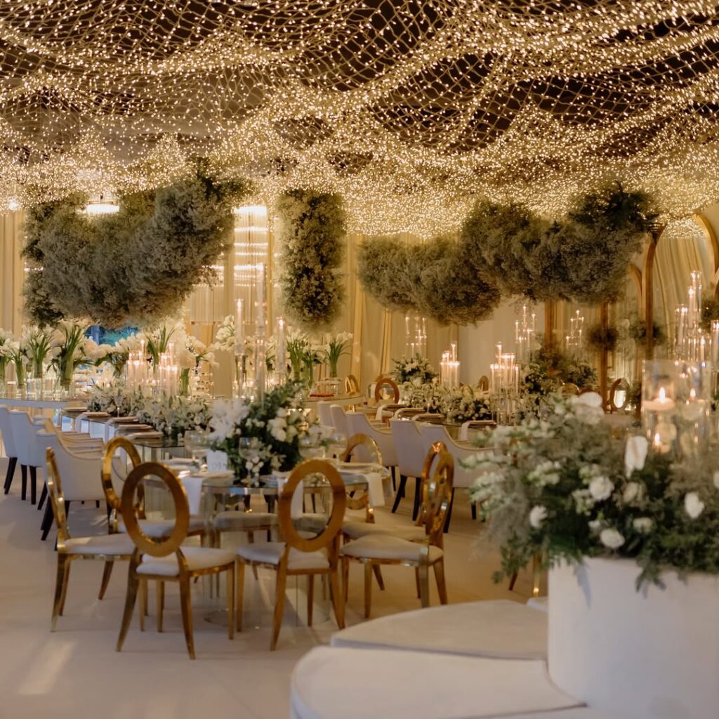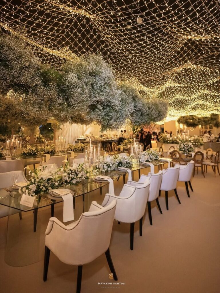 Ao mesmo tempo, as luzinhas acompanham a cenografia sem competir com ela. Como resultado, criam um fundo leve, destacam os arranjos e ajudam a manter a elegância do espaço. Nas mesas espelhadas, esse efeito ganha ainda mais presença, já que a luz se reflete e amplia a sensação de profundidade.